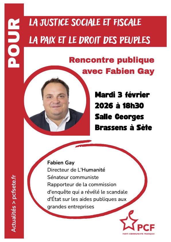 Fabien Gay à Sète le mardi 3 février Laisser un commentaire / Par admin / 21 janvier 2026 Partager sur FacebookTweeter